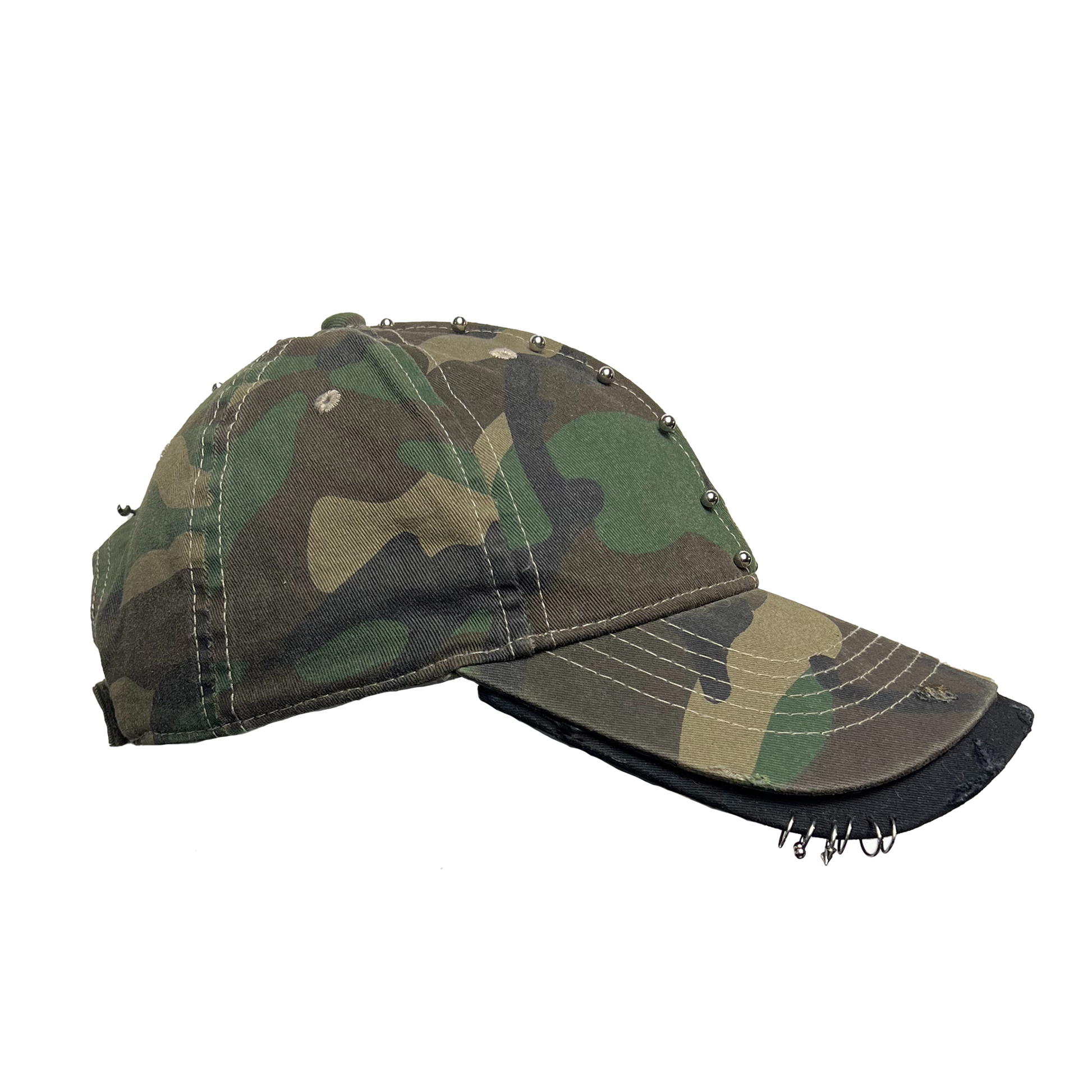 - DISTRESSED CAMO HAT WITH ADDITIONAL BLACK BRIM